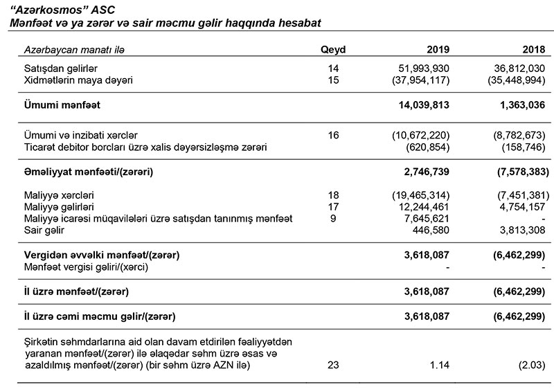 Maliyyə nəticələrini əks etdirən hesabata əsasən “Azərkosmos” 2019-cu ili 3,6 milyon manat xalis mənfəətlə başa vurub. Halbuki, dövlət şirləti 2018-ci ili 6,5 milyon manat xalis zərər ilə başa vurmuşdu.