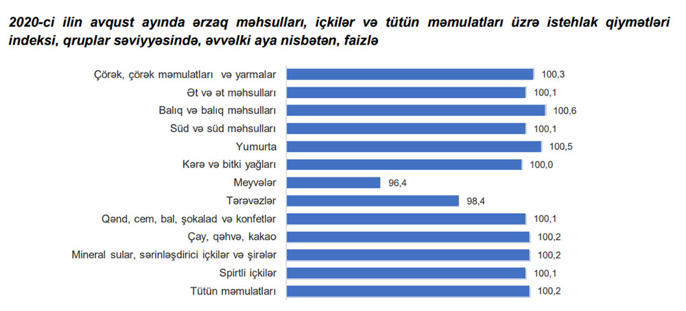 2020-ci ilin avqust ayında ərzaq məhsulları, içkilər və tütün məmulatları üzrə istehlak qiymətləri indeksi əvvəlki aya nisbətən 0,5% faiz azalıb, əvvəlki ilin avqust ayına nisbətən 4,9 faiz artıb.