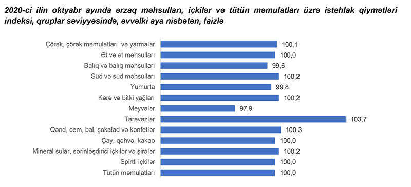 2020-ci ilin oktyabr ayında ərzaq məhsulları, içkilər və tütün məmulatları üzrə istehlak qiymətləri indeksi əvvəlki aya nisbətən 100,3 faiz, əvvəlki ilin oktyabr ayına nisbətən 104,4 faiz təşkil etmişdir.