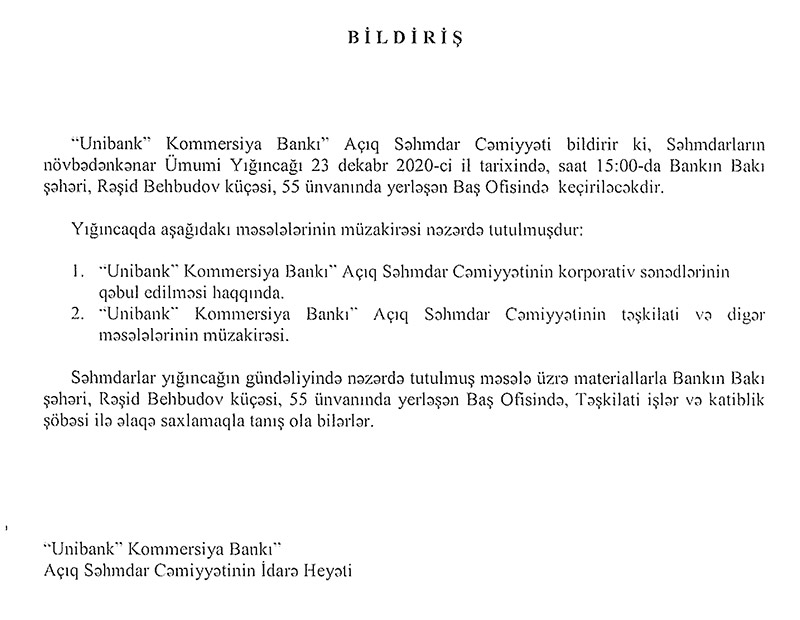 23 Dekabr 2020-ci il tarixində Unibank səhmdarlarının növbədənkənar ümumi yığıncağı keçiriləcək.