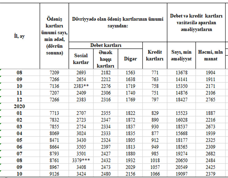 2020-ci ilin 10 ayı ərzində cəmi ödəniş kartlarının sayı 1 milyon 860 min ədəd artıb. 2019-cu ilin sonunda cəmi ödəniş kartlarının sayı 7 milyon 266 min ədəd təşkil etmişdi.