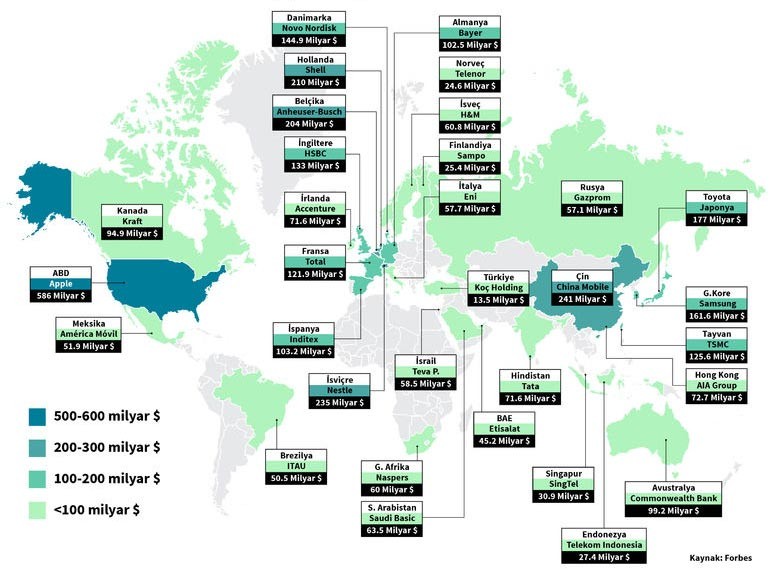 Dünyanın ən çox oxunan iqtisadiyyat jurnallarından biri olan Forbes-in dünyanın ən dəyərli şirkətləri siyahısına görə, dünya ölkələrinin ən dəyərli şirkətləri.