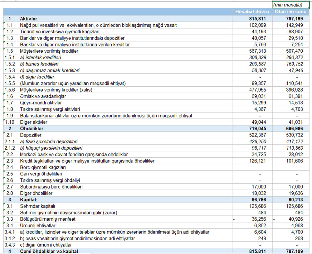Maliyyə nəticələrinə əsasən, 2020-ci il ərzində bankın aktivlərinın həcmində 4 % artım qeydə alınıb. Bununla da hesabat dövrünə bankın cəmi aktivləri 816 milyon manat təşkil edib. Ötən ilin nəticələrinə görə, Bankın məcmu kapitalının həcmində 3 % artım olub. Hesabat dövrünün sonuna Bankın məcmu kapitalı 83 milyon manata çatıb.
