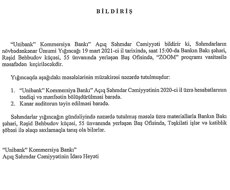 19 Mart 2020-ci il tarixində “Unibank Kommersiya Bankı” ASC-nin səhmdarlarının növbədənkənar ümumi yığıncağı keçiriləcək.