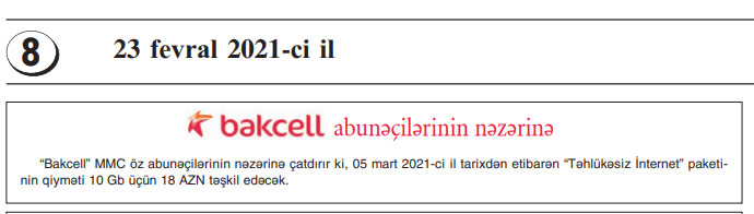 "“Bakcell” MMC öz abunəçilərinin nəzərinə çatdırır ki, 05 mart 2021-ci il tarixdən etibarən “Təhlükəsiz İnternet” paketinin qiyməti 10 Gb üçün 18 AZN təşkil edəcək",- elanda deyilir.
