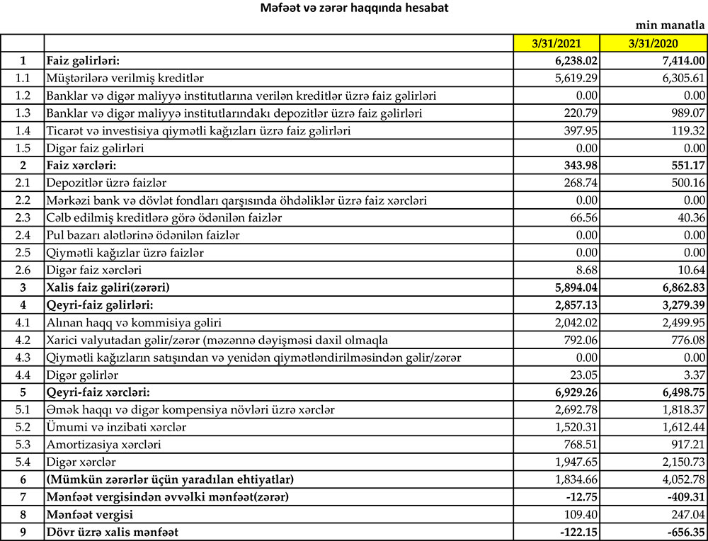 Müqayisə üçün qeyd edək ki, 2020-ci ilin ilk rübündə “Yapı Kredi Bank Azərbaycan”ın cəmi əməliyyat gəlirləri 10 milyon 693 min manat, cəmi əməliyyat xərcləri 7 milyon 50 min manat, əməliyyat mənfəəti 3 milyon 643 min manat, mümkün zərərlər üçün yaradılan ehtiyatlara ayırdığı məbləğ 4 milyon 53 min manat, ödənilmiş mənfəət vergisi 247 min manat, əməliyyat zərəri 656 min manat təşkil etmişdi.
