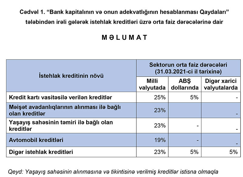 Son 1 ildə orta faiz dərəcəsi məişət avadanlıqlarının alınması ilə bağlı olan kreditlər üzrə 22%-dən 24%-ə, yaşayış sahəsinin təmiri ilə bağlı olan kreditlər üzrə 21%-dən 23%-ə, avtomobil kreditləri üzrə 17%-dən 19%-ə, digər istehlak kreditləri üzrə 22%-dən 23%-ə yüksəlib.