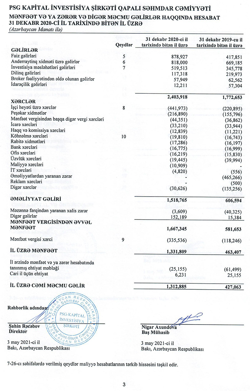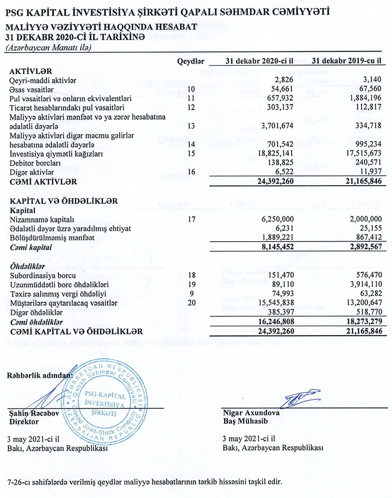 “PSG Kapital İnvestisiya Şirkəti” QSC 2020-ci ili 1 milyon 332 min manat xalis mənfəətlə başa vurub.