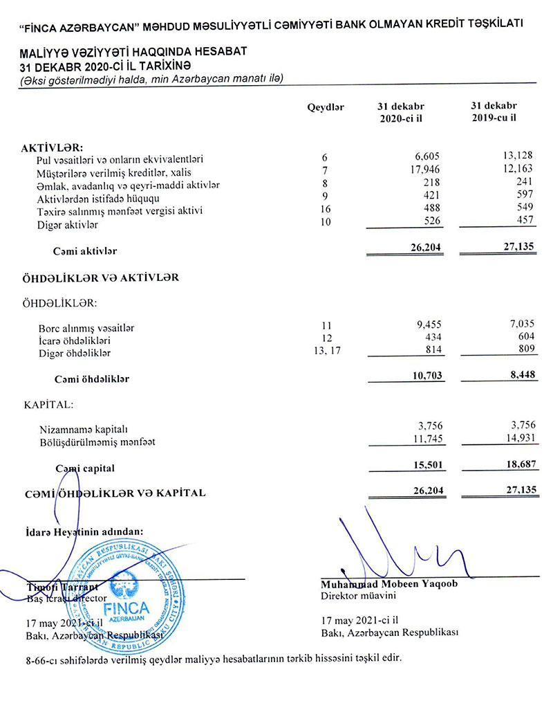 “FİNCA Azərbaycan” BOKT MMC 2020-ci il üzrə maliyyə hesabatını açıqlayıb.