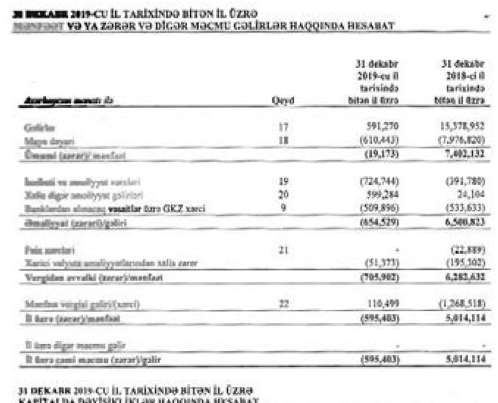 Marja şirkətin maliyyə hesabatlarına istinadən xəbər verir ki, 2018-ci ildə 15 milyon 378 min manat təşkil etmiş gəlirlər 2019-cu ildə 26 dəfə azalaraq 591 min manata düşüb.