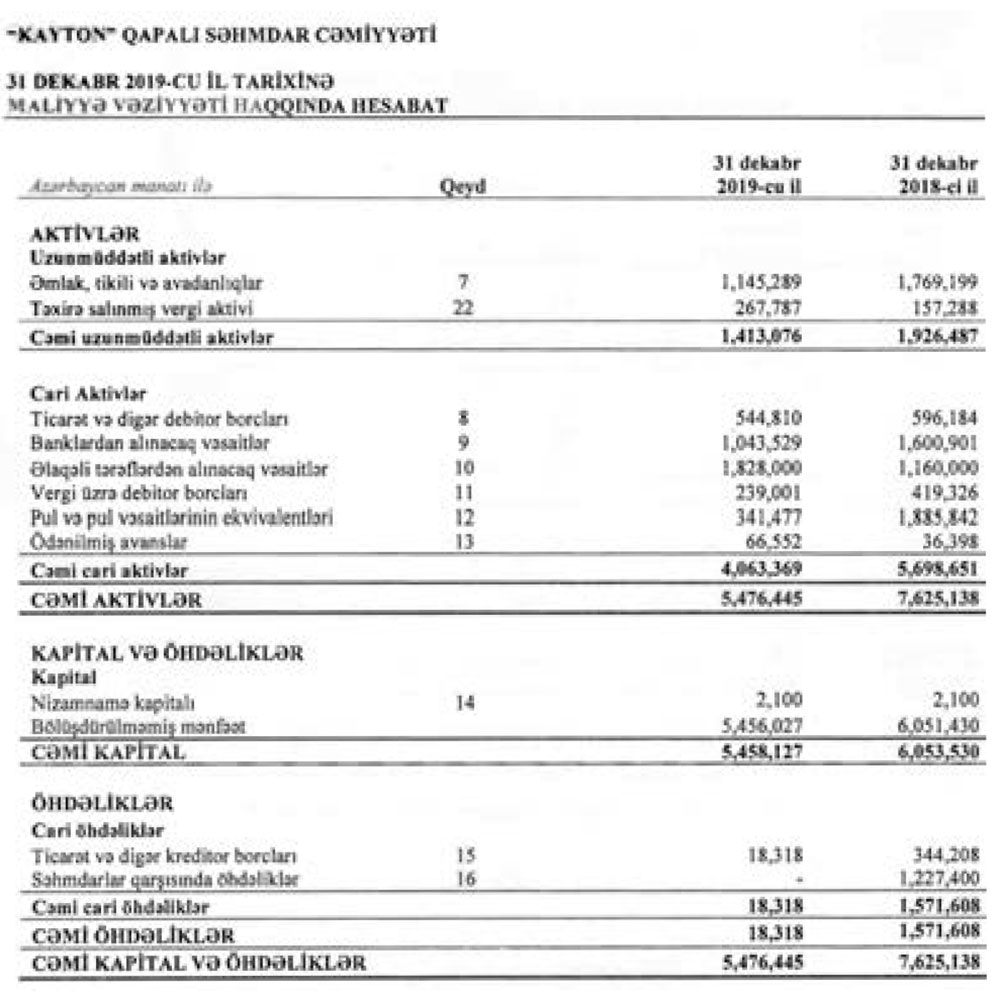 2010-cu ildən maşın və avadanlıqların icarəsi və təmir xidmətləri sahələrində fəaliyyət göstərən “Kayton” QSC 2019-cu ili 595 min manat xalis zərər ilə bağlayıb. Halbuki, Şirkət 2018-ci ili 5 milyon 14 min manat xalis mənfəət ilə bağlamışdı.