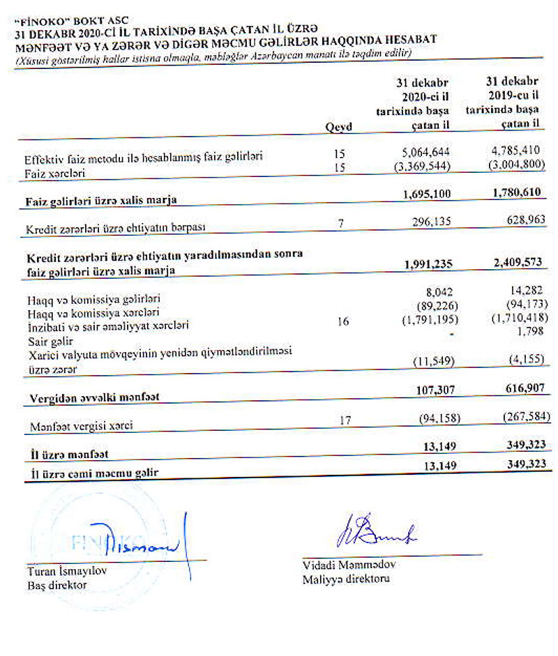 “Finoko” ASC bank olmayan kredit təşkilatı (BOKT) 2020-ci ili 13 min manat xalis mənfəətlə başa vurub.
