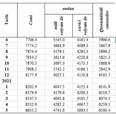 Ötən ilin sonunda əhalinin banklardakı əmanətləri 8 milyard 177 milyon 880 min manat, 2021-ci ilin mart ayının sonunda 8 milyard 147 milyon 480 min manat ikən, mayın sonunda 8 milyard 635 milyon 150 min manat təşkil edib.