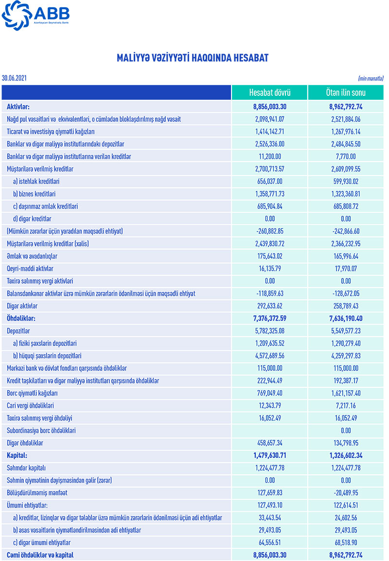 ABB 2021-ci ilin 1-ci rübünü (yanvar-mart dövrünü) 32 milyon 395 min manat xalis mənfəətlə bağlamışdı.