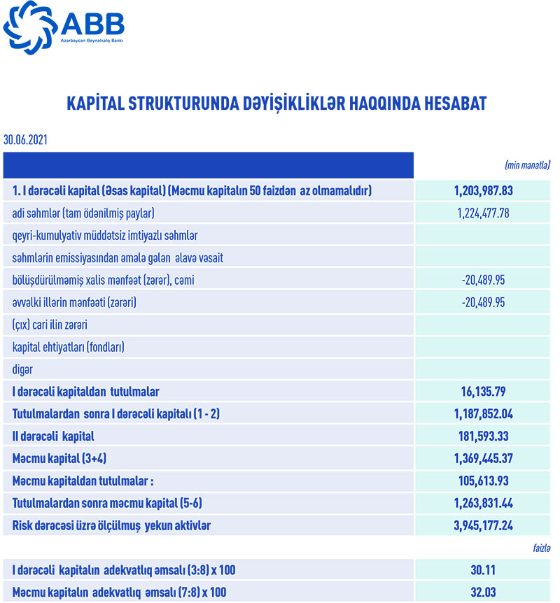 30 iyun 2021-ci il tarixində ABB 1 milyard 263 milyon 831 min manat məcmu kapitala malik olub.