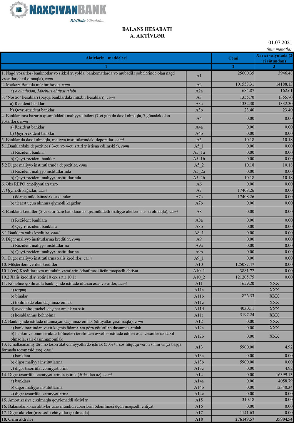 30 İyun 2021-ci il tarixində "Naxçıvanbank" 276 milyon 150 min manat cəmi aktivlərə, o cümlədən 125 milyon 87 min manat kredit portfelinə malik olub. Bank ötən ilin sonunda 241 milyon 859 min manat cəmi aktivlərə, o cümlədən 106 milyon 757 min manat kredit portfelinə malik idi.