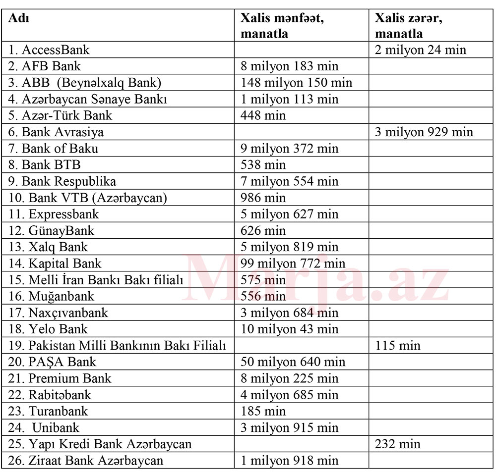26 bankdan 4-ü cari ilin ilk yarısını zərər ilə başa vurublar. Bu bankların cəmi zərəri 6 milyon 300 min manatdır.