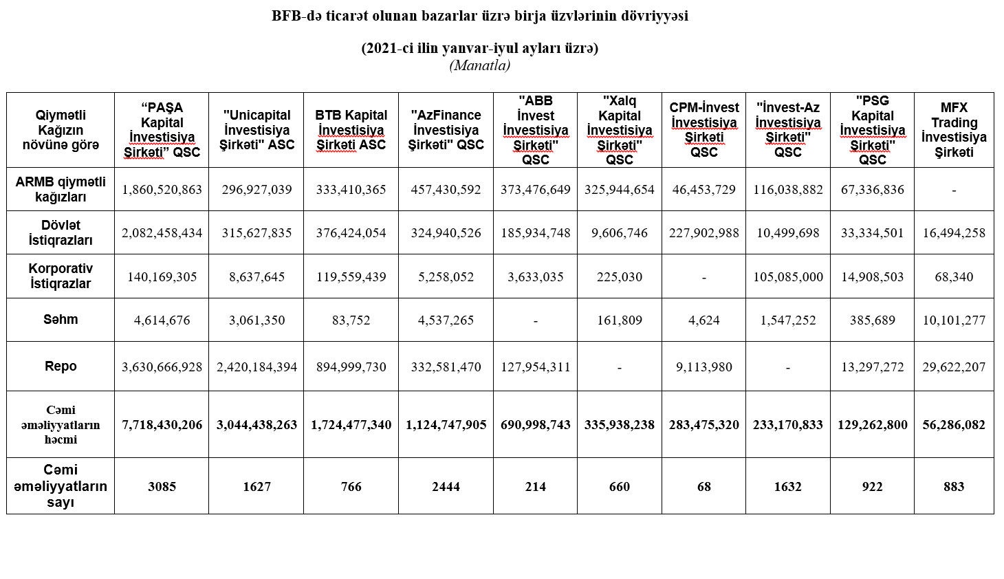 Marja Birjaya istinadən xəbər verir ki, 2021-ci ilin yanvar-iyul ayları ərzində, cəmi dövriyyənin məbləğinə görə, “PAŞA Kapital İnvestisiya Şirkəti” QSC 1-ci, “Unicapital İnvestisiya Şirkəti” ASC 2-ci, “BTB Kapital İnvestisiya Şirkəti” ASC 3-cü yeri tutub.