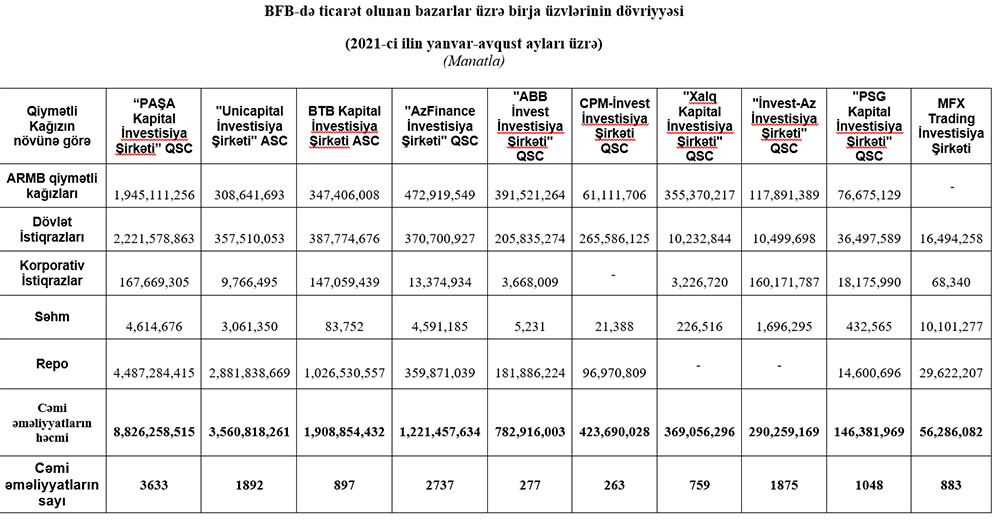 Marja xəbər verir ki, 2021-ci ilin yanvar-avqust ayları üzrə, “PAŞA Kapital İnvestisiya Şirkəti” 1-ci, "Unicapital İnvestisiya Şirkəti" AS 2-ci, BTB Kapital İnvestisiya Şirkəti ASCisə 3-cü yeri tutub.
