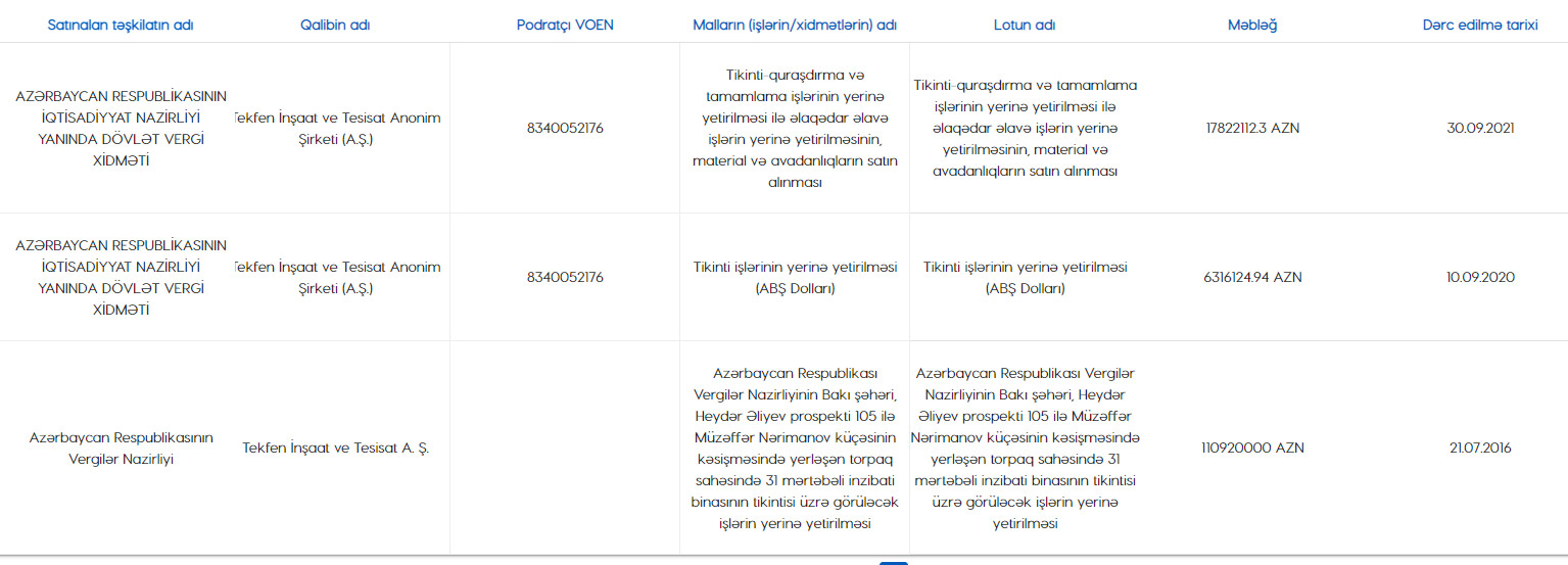 Dövlət Vergi Xidməti qalib şirkət ilə məbləği 17 milyon 822 min 112 manat olan müqavilə imzalayıb. Müqavilə tikinti-quraşdırma və tamamlama işlərinin yerinə yetirilməsi ilə əlaqədar əlavə işlərin yerinə yetirilməsinin, material və avadanlıqların satın alınmasını nəzərdə tutur.