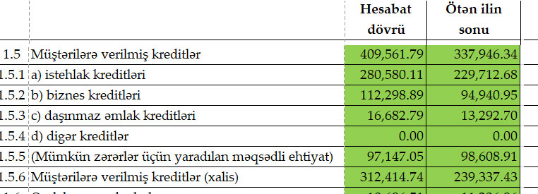 Məqsədli ehtiyat xaric kreditlər (xalis kredit portfeli) 73 milyon 78 min manat artaraq 312 milyon 145 min manata yüksəlib. Mümkün zərərlər üçün yaradılan məqsədli ehtiyat 1 milyon 462 min manat azalaraq 97 milyon 147 min manata geriləyib.