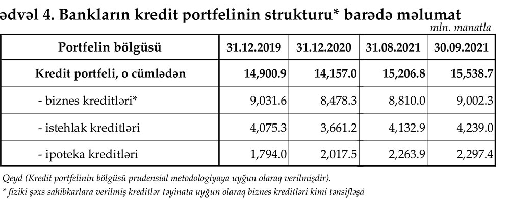 30 sentyabr 2021-ci il tarixində Azərbaycan bankları tərəfindən müştərilərə verilmiş cəmi kreditlər 15 milyard 538,7 milyon manata çatıb.