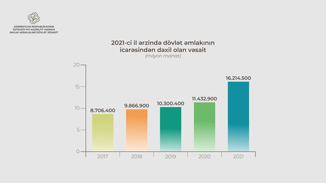 Daşınmaz dövlət əmlakının (qeyri-yaşayış və torpaq sahələrinin) icarəsindən ötən ildə dövlət büdcəsinə ümumilikdə 16,2 milyon manatdan artıq vəsait ödənilib və illik proqnoz 147,4% yerinə yetirilib. Qeyd edək ki, 2019-cu illə müqayisədə 2021-ci ildə icarədən dövlət büdcəsinə 4,8 milyon manat və ya 41,7%, 2020-ci illə müqayisədə isə 5,9 milyon manat və ya 57,4% çox vəsait ödənilib.