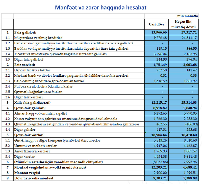 Bankın yaydığı press-relizdə bildirilir ki, keçən ilin müvafiq dövründə bu göstərici 5 milyon 388 min manat idi ki, bu da müqayisədə xalis mənfəətin 3 milyon 914 min manat və ya 73 % artmı deməkdir.