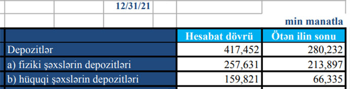 Ötən il "Turanbank"da fiziki şəxslərin (əhalinin) depozitləri 43 milyon 734 min manat artaraq 257 milyon 631 min manata, hüquqi şəxslərin (şirkətlərin) depozitləri isə 93 milyon 486 min manat artaraq 159 milyon 821 min manata yüksəlib.
