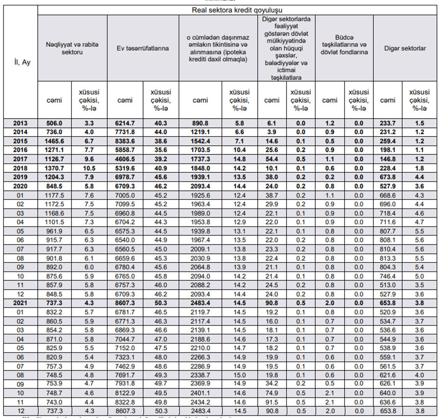 Ev təsərrüfatlarına veriləmiş 8 milyard 607.3 milyon manatlıq kreditlərin 2 milyard 483.4 milyon manatını daşınmaz əmlakın tikintisinə və alınmasına (ipoteka krediti daxil olmaqla) verilən kreditlər təşkil edib. Ötən il bu kreditlər 390 milyon manat artıb və cəmi kredit qoyuluşlarında xüsusi çəkisi 14,4%-dən 14,5%-ə yüksəlib.