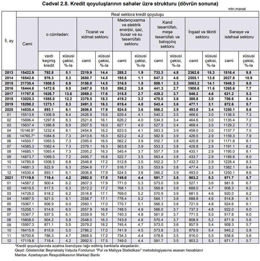 Aərbaycanda ev təsərrüfatlarına verilən kreditlər (əsasən istehlak kreditləri) 2020-ci illə müqayisədə 2021-ci ildə 1 milyard 898 milyon manat artaraq 8 milyard 607,3 milyon manata çatıb. 2020-ci ilin sonunda ev təsərrüfatlarına verilən kreditlər 6 milyard 709,3 milyon manat təşkil etmişdi.