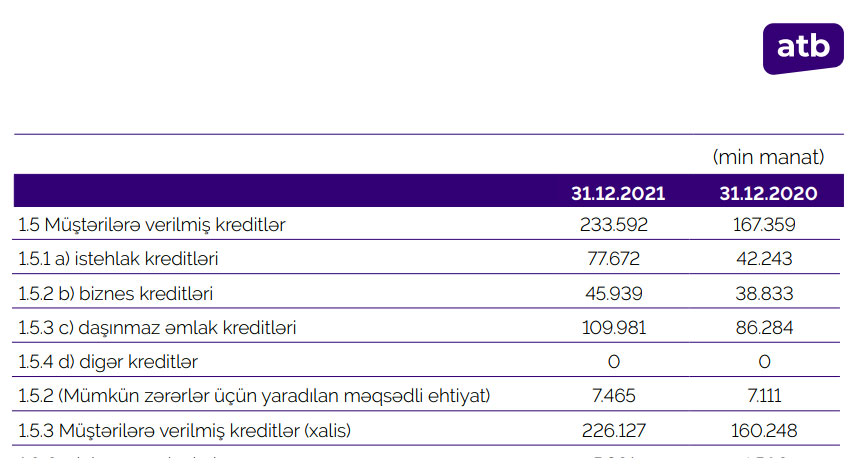 Ötən il Bankın istehlak kreditləri portfeli 35 milyon 429 min manat artaraq 77 milyon 672 min manata, biznes kreditləri portfeli 7 milyon 106 min manat artaraq 45 milyon 939 min manata, daşınmaz əmlak (ipoteka) kreditləri portfeli isə 23 milyon 697 min manat artaraq 109 milyon 981 min manata yüksəlib.