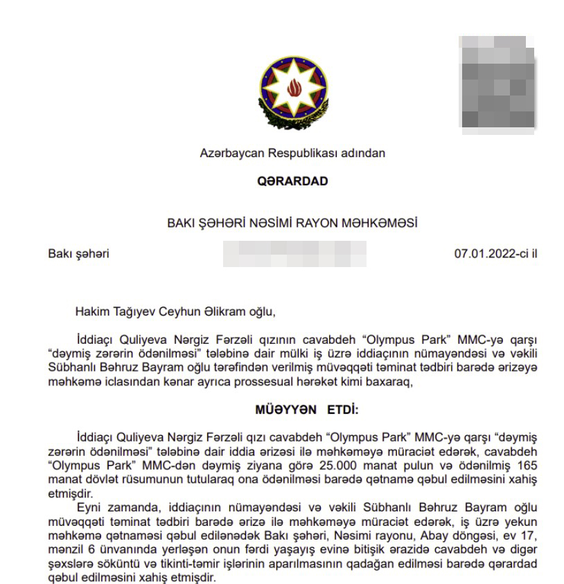 Məlumata görə, bununla bağlı yanvarın 7-də Nəsimi rayon məhkəməsi qərardad çıxarıb. İş üzrə yekun məhkəmə aktı qəbul edilənədək, Bakı şəhəri, Nəsimi rayonu, Abay döngəsi, ev 17, mənzil 6 ünvanında yerləşən iddiaçı Quliyeva Nərgiz Fərzəli qızının fərdi yaşayış evinə bitişik ərazidə tikinti-təmir və söküntü işlərinin aparılması cavabdeh “Olympus Park” MMC-yə və digər şəxslərə qadağan edilib.
