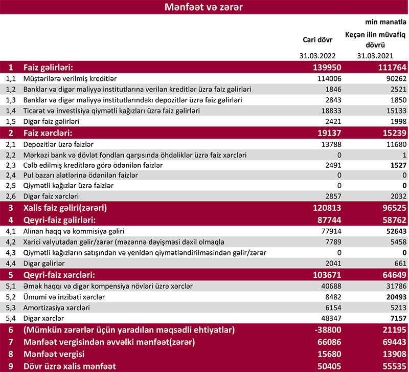 İlk rübdə mümkün zərərlər üçün yaradılan məqsədli ehtiyatlara 38 milyon 800 min manat ayrıldığı və 15 milyon 680 min manat mənfəət vergisi ödənildiyi üçün "Kapital Bank"ın mənfəəti azalıb. 2021-ci ilin eyni dövründə 21 milyon 195 min manat ehtiyatlara ayrılmış və 13 milyon 908 min manat mənfəət vergisi ödəmişdi..
