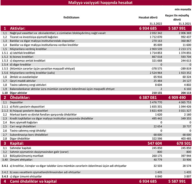 "Kapital Bank" ASC 2022-ci ilin 1-ci rübü üzrə (yanvar-mart dövrü) əsas maliyyə göstəricilərini açıqlayıb.