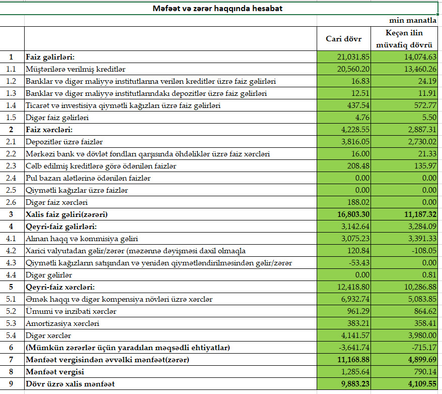 Xatırladaq ki, 2021-ci ilin 1-ci rübündə “Bank of Baku”nun cəmi əməliyyat gəlirləri 17 milyon 359 min manat, cəmi əməliyyat xərcləri 13 milyon 174 min manat, əməliyyat mənfəəti 4 milyon 185 min manat təşkil etmişdi. Ehtiyatdan azad olmuş 715 min manat mənfəətə əlavə edilmiş və Bank 4 milyon 900 min manat mənfəətindən 790 min manat mənfəət vergisi ödəmişdi.