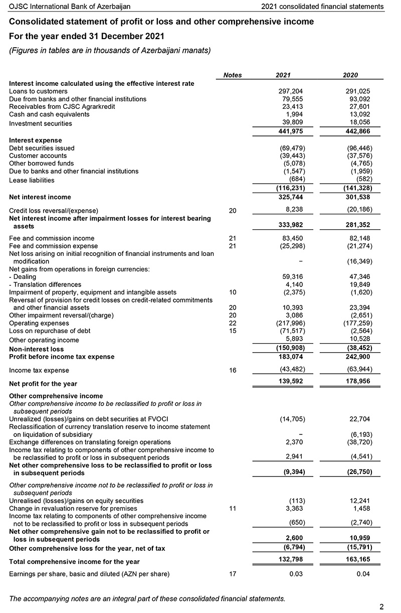 Hesabatda 2021-ci ilin maliyyə hesabatında Bankın avrobondları vaxtından əvvəl geri alışı ilə əlaqədar 71 milyon 517 min manat birdəfəlik zərər (2020-ci il 2 milyon 500 min manat) açıqlanıb. Bankdan verilən məlumata görə, qeyd olunan zərər Bankın özü tərəfindən xarici bazarda emissiya edilmiş avrobondların bir hissəsinin vaxtından əvvəl geri alışı ilə bağlıdır. Qeyd olunmalıdır ki, bu əməliyyat nəticəsində real pul axını itkisi mövcud deyil (uçot ilə bağlıdır) və əməliyyat bankın güclü likvidlik mövqeyinin olduğunu bir daha göstərir. Qeyd olunan əməliyyat nəticəsində buraxılmış borc qiymətli kağızları üzrə öhdəliklər 762 milyon 236 min manat azalıb. Bankın faiz xərclərinə il ərzində 27 milyon manata yaxın qənaət edilib. Qeyd olunan birdəfəlik əməliyyatın nəticəsi müqayisə olunan illər üzrə istisna edilərsə, Bankın 2021-ci və 2020 illərdə vergidən əvvəl xalis mənfəəti müvafiq olaraq 254 milyon 591 min manat və 245 milyon 464 min manat təşkil edib ki, bu da ötən illə müqayisədə 10 milyon manata yaxın artım deməkdir.