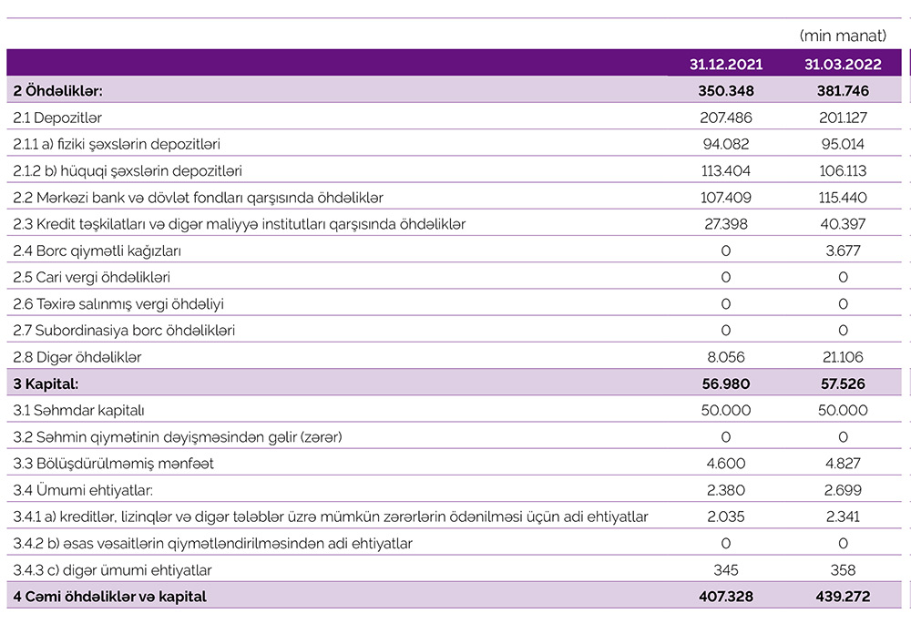 Cəmi bank öhdəliklərinin həcmi 381,7 milyon manat təşkil etmişdir.