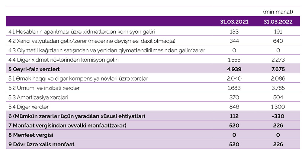 Ümumi gəlirlər 9,6 milyon manat, xərclər 9,4 milyon manat təşkil etmişdir. Birinci rübdə Bank 226,5 min manat həcmində xalis mənfəət əldə edib.