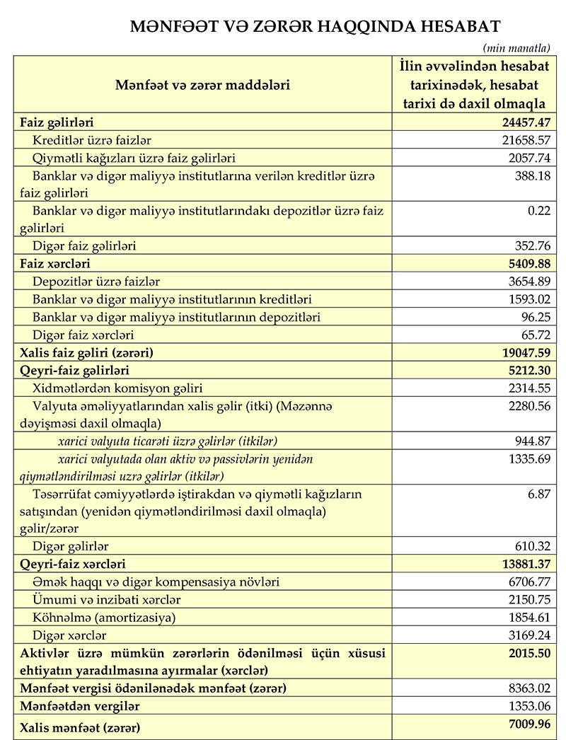 Xatırladaq ki, 2021-ci ilin ilk rübündə Xalq Bankın cəmi əməliyyat gəlirlər 25 milyon 589 min manat, cəmi əməliyyat xərcləri 17 milyon 418 min manat, əməliyyat mənfəəti 8 milyon 171 min manat, aktivlər üzrə mümkün zərərlərin ödənilməsi üçün xüsusi ehtiyatın yaradılmasına ayrılan vəsait 2 milyon 1 min manat, mənfəət vergisi 1 milyon 471 min manat təşkil etmişdi.