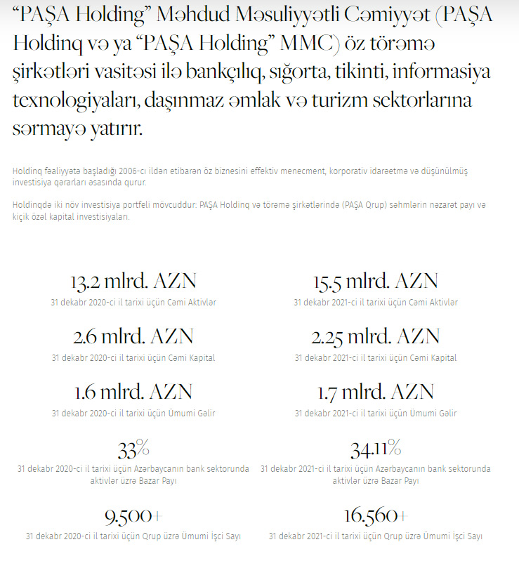 31 dekabr 2021-ci il tarixində PAŞA Holdinqin Azərbaycanın bank sektorunda aktivlər üzrə bazar payı 34.11% (əvvəlki il 33%) təşkil edib.