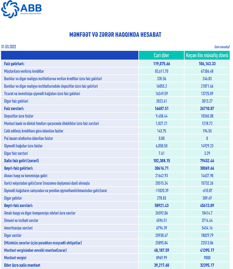 2021-ci ilin 1-ci rübü ilə müqayisədə 2022-ci ilin 1-ci rübündə ABB-nin faiz gəlirləri 12 milyon 912 min manat və ya 12,2% artaraq 119 milyon 75 min manat, qeyri-faiz gəlirləri isə 547 min manat artaraq 30 milyon 617 min manat təşkil edib. ABB-nin müştərilərə verdiyi kreditlər üzrə faiz gəlirləri 16 milyon 305 min manat, qiymətli kağızlar üzrə faiz gəlirləri isə 2 milyon 523 min manat artıb.