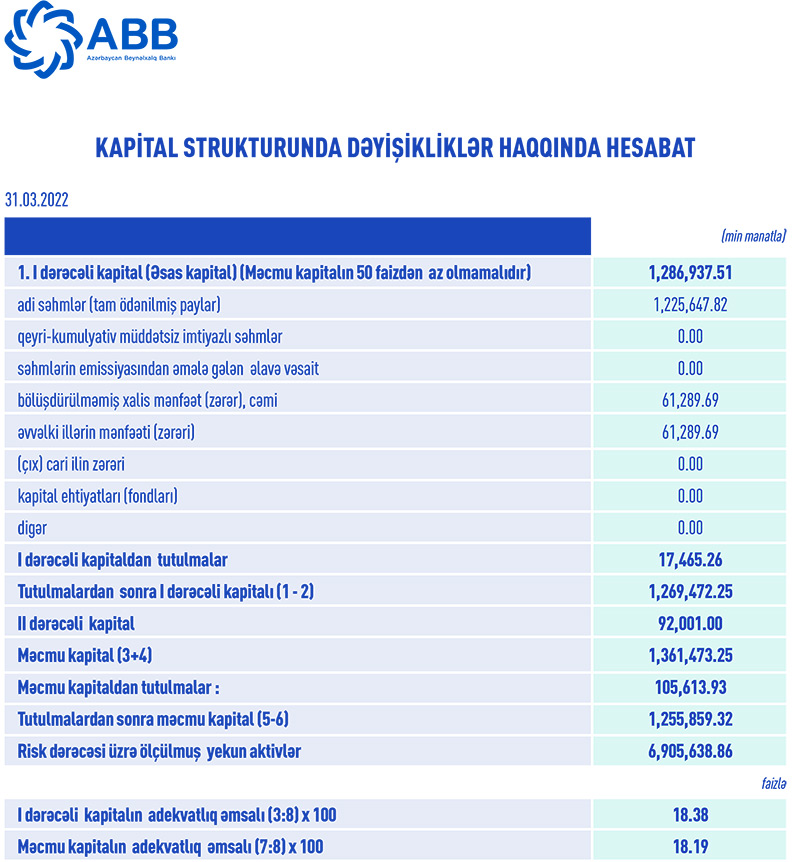 31 mart 2022-ci il tarixində ABB 1 milyard 255 milyon 859 min manat məcmu kapitala malik olub. İlk rüb ərzində ABB-nin 1-ci dərəcəli kapitalının adekvatlıq əmsalı 18.38%, məcmu kapitalının adekvatlıq əmsalı 18.19% təşkil edib. Beləliklə, Bankın kapital adekvatlığı göstəriciləri tənzimləyici orqanın müəyyən etdiyi normalardan (müvafiq olaraq sistem əhəmiyyətli banklar üçün 6% və 12%) yüksək qalmaqdadır.
