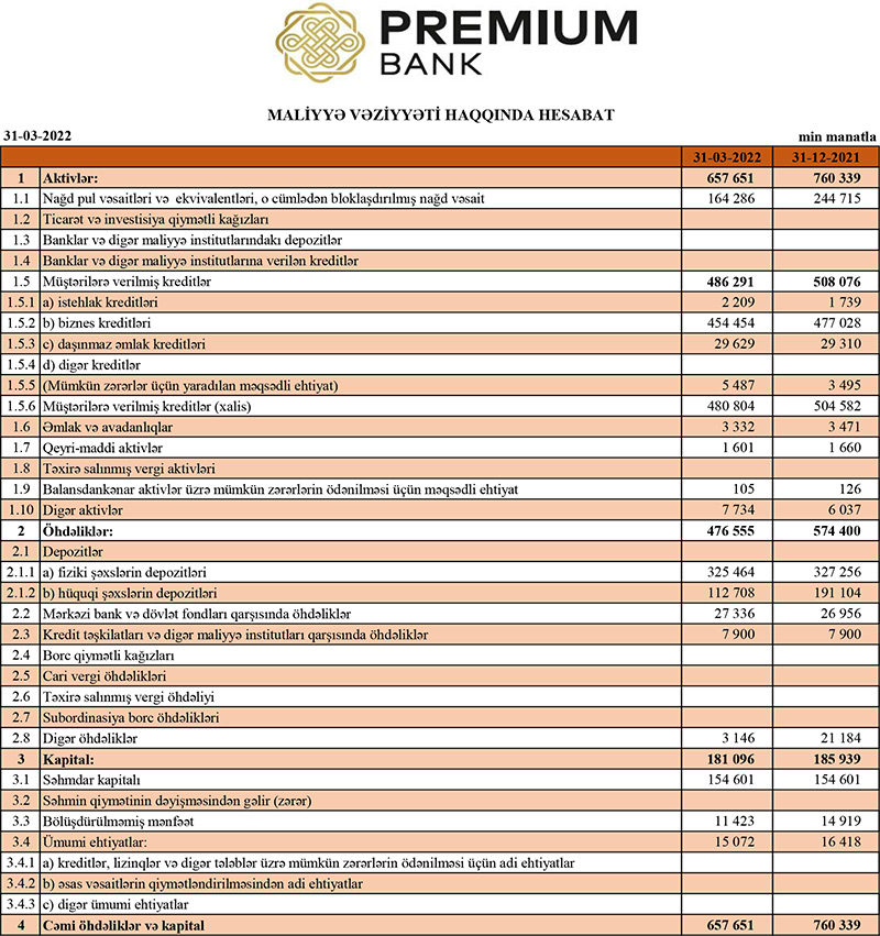 Xatırladaq ki, 2021-ci ilin ilk rübündə "Premium Bank"ın cəmi əməliyyat gəlirləri 11 milyon 3 min manat, cəmi əməliyyat xərcləri 11 milyon 665 min manat, əməliyyat zərəri 662 min manat təşkil etmişdi. Ehtiyatlardan azad olmuş 6 milyon 6 min manatın hesabına həm əməliyyat zərəri bağlanmış, həm də bankın 5 milyon 345 min manat xalis mənfəəti yaranmışdı.