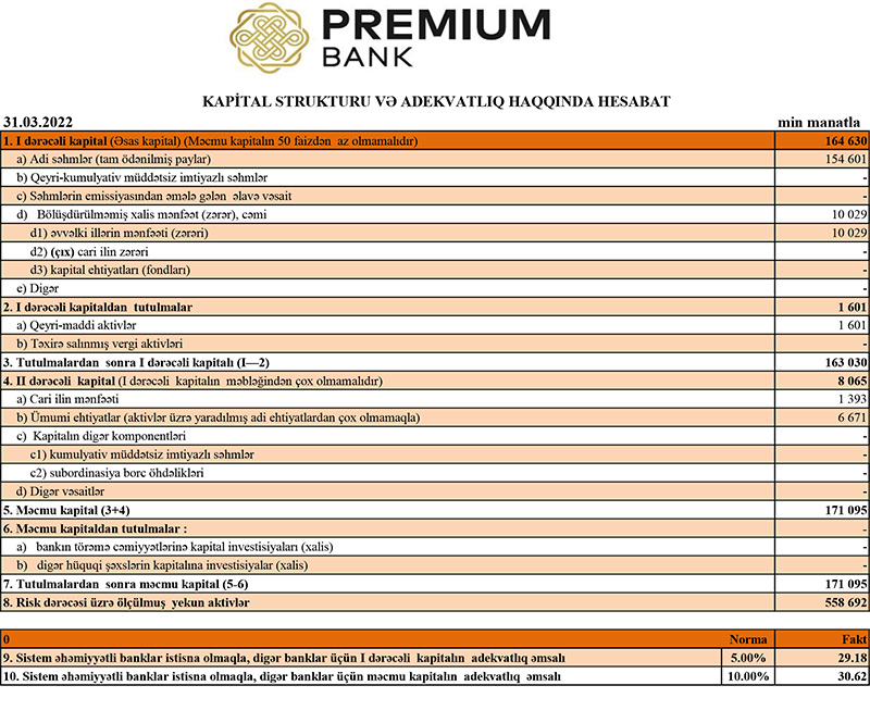 31 Mart 2022-ci il tarixində "Premium Bank" 171 milyon 95 min manat məcmu kapitala malik olub.