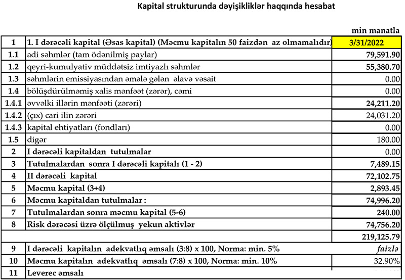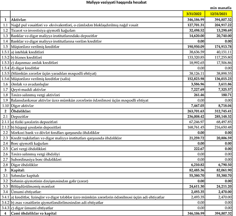 Marja.az xəbər verir ki, ötən ilin sonu ilə müqayisədə Bankın kredit portfeli (müştərilərə verilmiş kreditlər) 16 milyon 36 min manat və ya 9,2% artaraq 31 mart 20222-ci il tarixində 190 milyon 950 min manata çatıb. Eyni tarixdə Bankın cəmi aktivləri 346 milyon 187 min manat təşkil edib