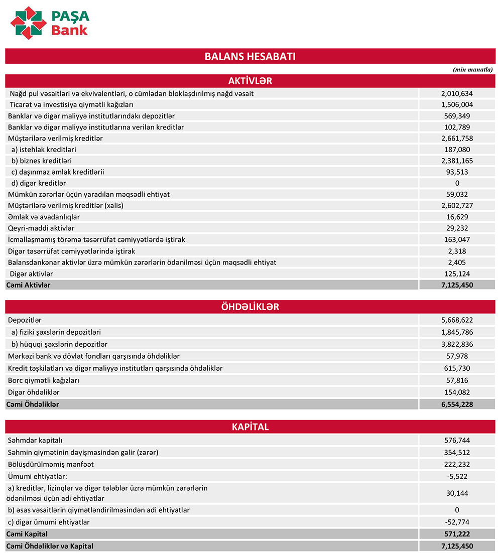 31 Mart 2022-cii l tarixində PAŞA Bank 7 milyard 125 milyon 450 min manat cəmi aktivlərə, o cümldən 2 milyard 661 milyon 58 min manat kredit portfelinə (müştərilərə verilmiş kreditlər) malik olub. Bank 2021-ci ilin sonunda 6 milyard 408 milyon 381 min manat cəmi aktivlərə və 2 milyard 545 milyon 578 min manat kredit portfelinə malik idi. İlk rübdə Bankın aktivləri 717 milyon 69 min manat və ya 11,2%, kredit portfeli isə 116 milyon 180 min manat və ya 4,6% artıb.
