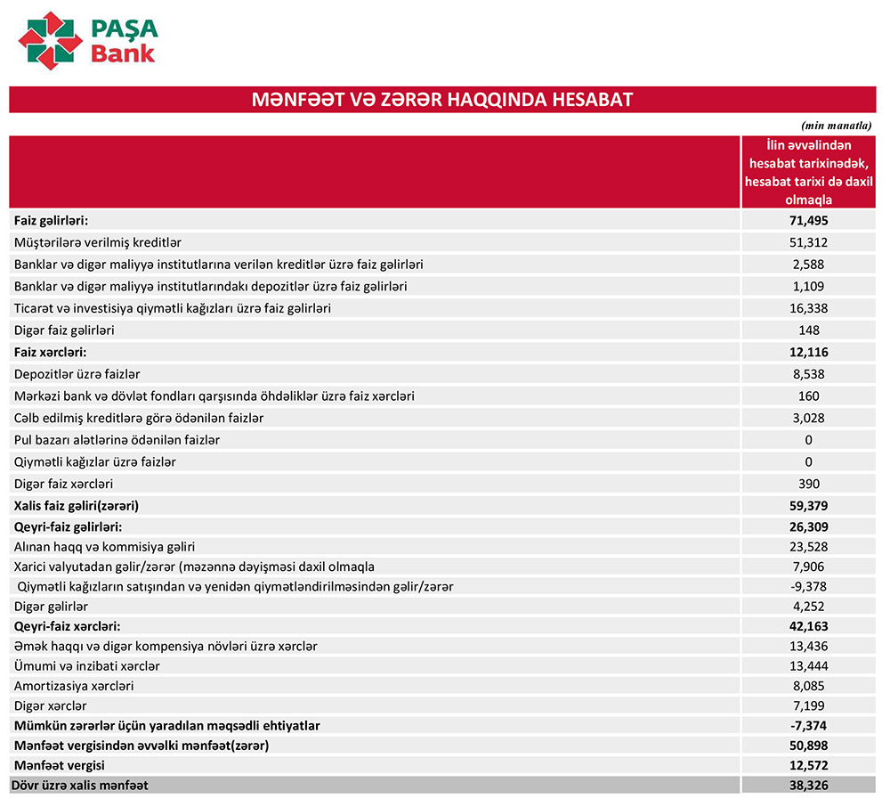 2022-ci ilin 1-ci rübündə "PAŞA Bank"ın cəmi əməliyyat gəlirləri (faiz və qeyri-faiz gəlirləri) 97 milyon 804 min manat, cəmi əməliyyat xərcləri (faiz və qeyri-faiz xərcləri) 54 milyon 279 min manat, gəlirlər xərcləri üstələdiyindən əməliyyat mənfəəti 43 milyon 525 min manat təşkil edib. Eyni zamanda, mümkün zərərlər üçün yaradılan məqsədli ehtiyatlardan azad olmuş 7 milyon 374 min manat mənfəətə əlavə edilib. PAŞA Bank 12 milyon 572 min manat mənfəət vergisi ödədiyindən ilk rübü 38 milyon 326 min manat xalis mənfəət ilə bağlayıb.