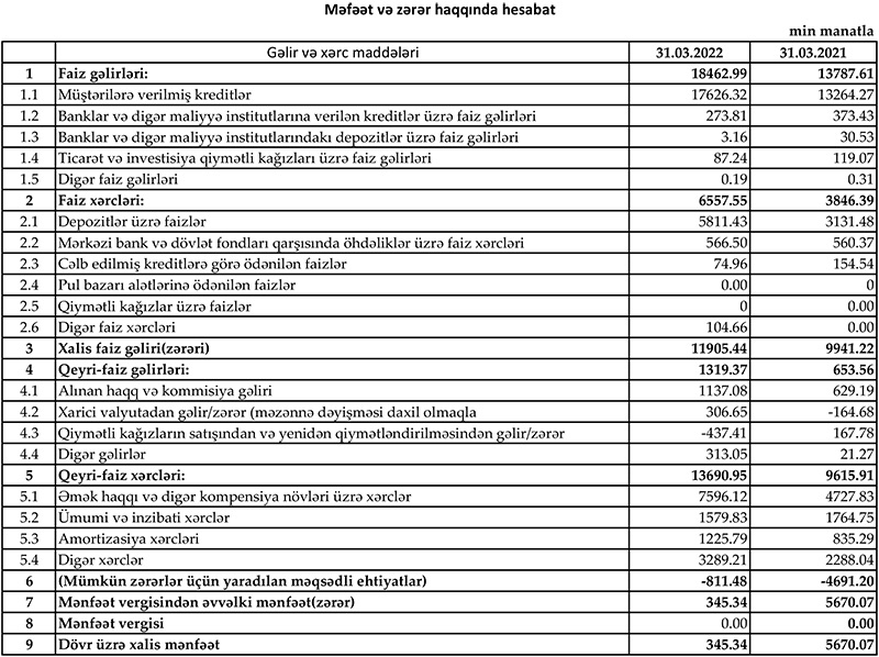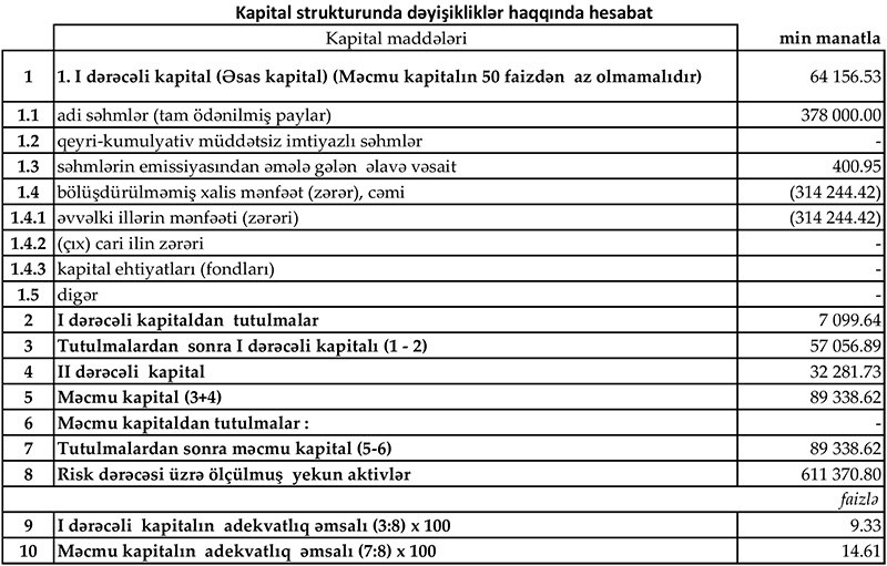 O cümlədən, Bankın biznes kreditləri portfeli 23 milyon 247 min manat artaraq 281 milyon 909 min manata, istehlak kreditləri portfeli 7 milyon 458 min manat artaraq 119 milyon 10 min manata çatıb, ipoteka kreditləri portfeli isə 4 milyon 432 min manat azalaraq 71 milyon 390 min manata düşüb.