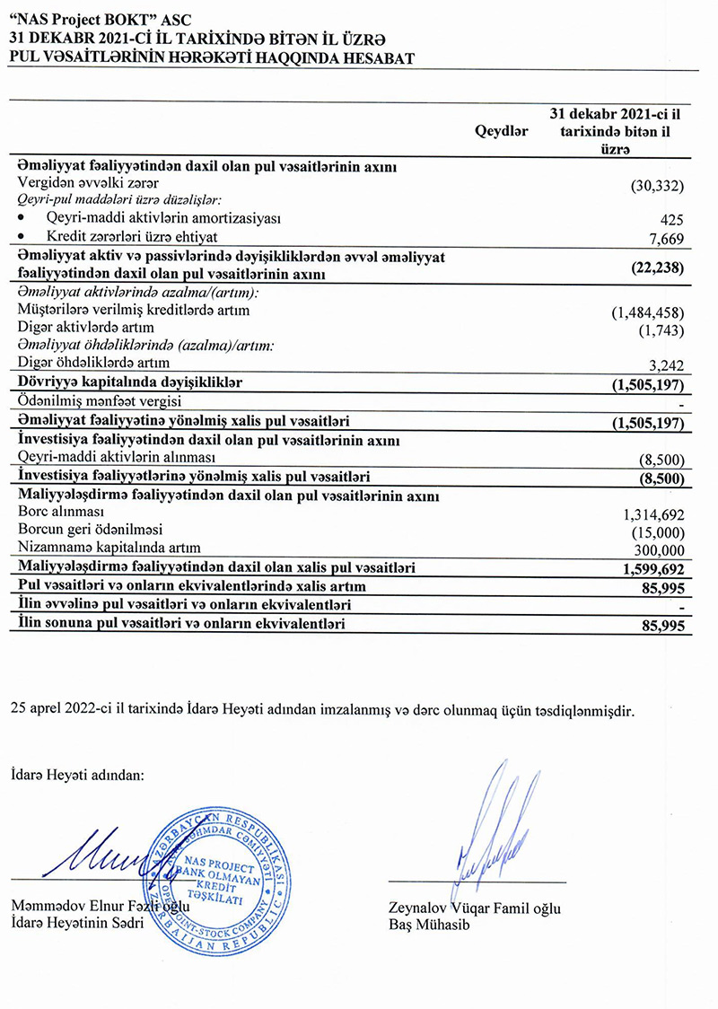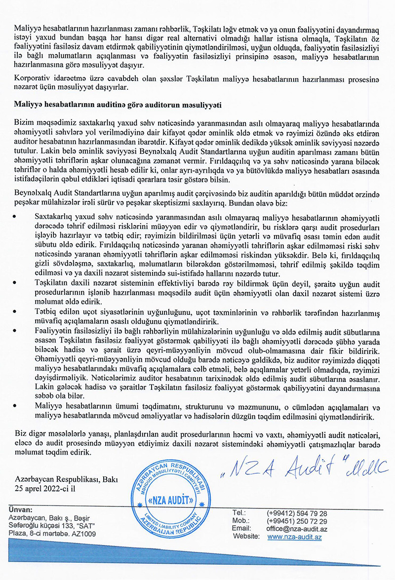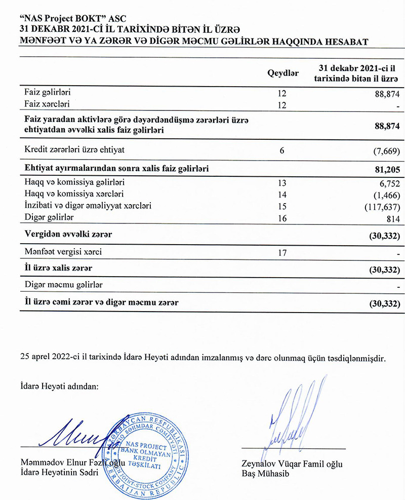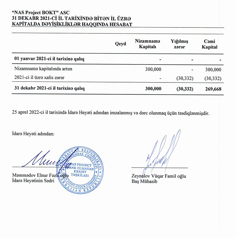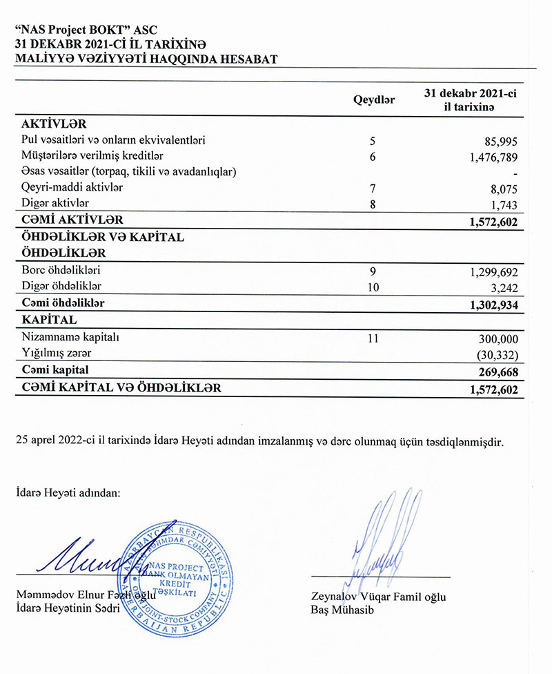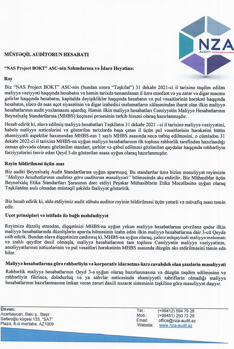 2021-ci ildə fəaliyyətə başlamış “NAS Project BOKT” ASC 31 dekabr 2021-ci il tarixində bitən il üzrə audit olunmuş maliyyə hesabatlarını açıqlayıb.